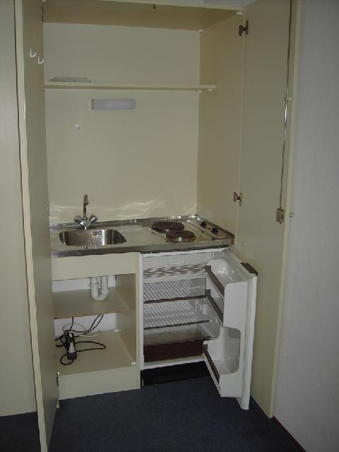 Es verfügt über eine separate Diele, einen direkt angrenzenden Abstellraum, ein weiß gefliestes Duschbad und eine Pantryküche. Sie enthält einen Kühlschrank mit Gefrierfach, zwei Elektrokochplatten und eine Spüle. Blauer Teppichboden. Durch große Glasfensterflächen und Balkontür erhellt. Balkon zur Grünanlage. Zusätzlicher Kellerraum.